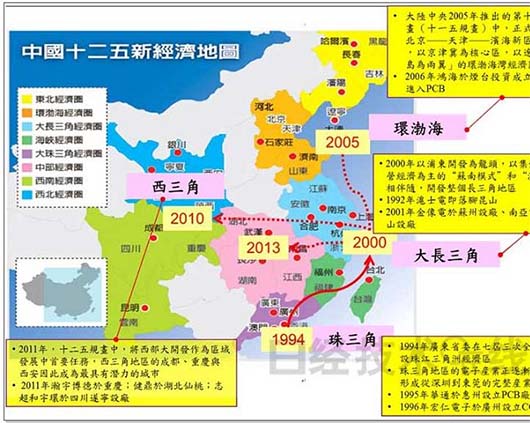 跟隨著中國(guó)大陸開(kāi)發(fā)腳步與政策推動(dòng),PCB產(chǎn)業(yè)依循同樣腳步進(jìn)行布局,包括1994年的珠三角開(kāi)發(fā)區(qū)、2000年長(zhǎng)三角開(kāi)發(fā)區(qū)、2005年環(huán)渤海開(kāi)發(fā)區(qū)以及2010年中央開(kāi)始推動(dòng)大西部開(kāi)發(fā)的西三角開(kāi)發(fā)區(qū);而臺(tái)從1994年華通于惠州設(shè)立PCB廠開(kāi)始,臺(tái)灣PCB廠商于中國(guó)大陸也跟循大開(kāi)發(fā)政策進(jìn)行布局,目前主要集中在華南、華東,而從2010年開(kāi)始也有臺(tái)商開(kāi)始進(jìn)駐重慶、成都等西部城市。