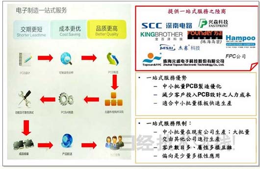 由于消費(fèi)電子產(chǎn)品的多樣化、生命周期愈來(lái)愈短,造成產(chǎn)品邁向量少、高客制化,也因此大陸PCB廠皆積極投入此領(lǐng)域,進(jìn)行利基型競(jìng)爭(zhēng);一站式服務(wù)優(yōu)點(diǎn)有以下:包括可以進(jìn)行中小批量PCB制造優(yōu)化、減少客戶投入PCB設(shè)計(jì)之人力成本、適合中心批量樣板快速生產(chǎn);然而也有其限制,包括中小批量在現(xiàn)有公司生產(chǎn),然大批量在缺乏產(chǎn)能支持下,比須轉(zhuǎn)由其它公司生產(chǎn),造成產(chǎn)線轉(zhuǎn)換之成本;一站式服務(wù)處理之客戶數(shù)目多、屬性多樣且雜,造成PCB廠商在管理上之難度,而應(yīng)用也是鎖定少量多樣性應(yīng)用;包括深南電路、興森快捷、杰賽科技、珠海方正、珠海元盛電子等,都已積極布局一站式快板服務(wù)。
