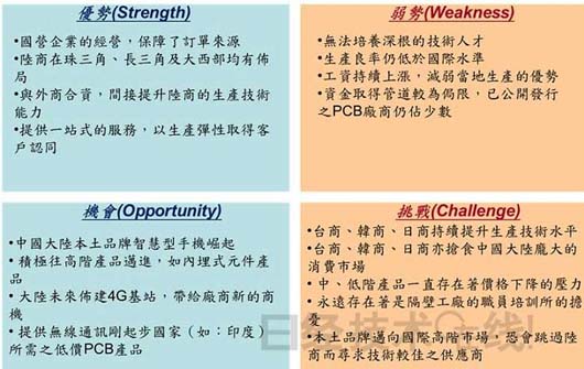 中國(guó)大陸雖然已經(jīng)成為全球最大電子零組件生產(chǎn)基地,然而在技術(shù)與產(chǎn)品布局部分,中國(guó)大陸本土陸資廠與全球主要領(lǐng)導(dǎo)大廠仍有一段距離;然而也由于長(zhǎng)期在中小型、本土品牌市場(chǎng)耕耘,也因此取得較為利基型市場(chǎng),不用參與全球電子零組件產(chǎn)業(yè)高度競(jìng)爭(zhēng)。透過(guò)SWOT構(gòu)面,針對(duì)中國(guó)大陸本土陸資電子零組件產(chǎn)業(yè)進(jìn)行分析與總整。